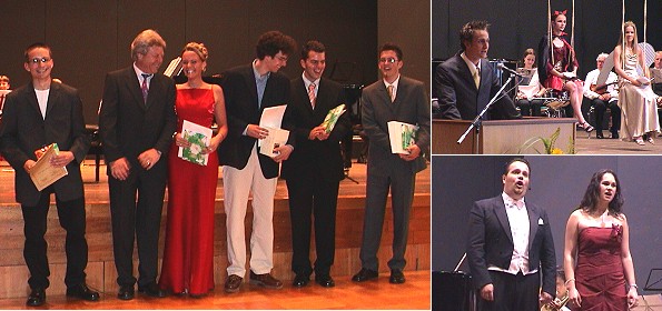Abiturienten 2002 - mit Elan in die Zukunft Gute Laune bei Preisträgern und Schulleiter: v.l. Björn Gärtner, Günter Wiedemer, Eva Weidemann, Florian Kley, Matthias Huck und Matthias Kronenwett. Rechts oben Sebastian Birkel mit Luise Kühnemund und Aline Stenger (v.l.). Rechts unten Wolfgang Rick und Sonja Westermann bei ihrem Liedvortrag. (Fotos:Richter)(hr) 73 frischgebackene Abiturientinnen und Abiturienten durften heute abend in der Eberbacher Stadthalle ihre Zeugnisse in Empfang nehmen. Die Durchschnittsnote der diesjährigen Reifeprüfungen liegt bei 2,19. Allein 28 Schülerinnen und Schüler schafften eine Abiturnote mit einer 1 vor dem Komma. Einer von ihnen, Björn Gärtner, fuhr gar eine glatte 1,0 ein.