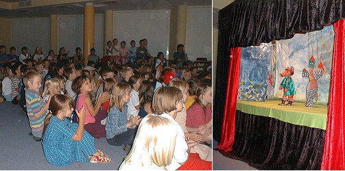 Trolljunge Haudidudi in der Schule zu Gast (Fotos:Richter)(hr) (cr) Heute durften rund 300 Schülerinnen und Schüler der 1. und 2. Klassen der Steige- und Dr.-Weiß-Grundschule ein besonderes Theaterstück genießen. Polizeihauptkommisar Dieter Jeitner vom Polizeirevier Eberbach und Jugendsachbearbeiter bei der Kommunalen Kriminalprävention Rhein-Neckar e.V. begrüßte die Kinder in der Steigegrundschule zum Marionettentheaterstück "Haudidudi Rumpelpumpel". In dem Stück wurde von dem Trolljungen Haudidudi erzählt, der es liebt andere zu ärgern, schlimme Streiche auszuhecken und auch nicht davor zurückschreckt mal richtig zuzuhauen. Zum Glück gibt es die Dorfgemeinschaft, die beschließt, den kleinen Troll wieder zur Vernunft zu bringen. Zum Schluss der Geschichte wird allen klar, dass Probleme mit Worten und klaren Regeln geklärt werden können. Die Schulkinder waren begeistert, klatschten und sangen mit und durften nach der Veranstaltung alle Marionettenpuppen genau begutachten. Hanne Heinstein, die seit 20 Jahren das Heidelberger Marionettentheater "TrollToll" leitet, schreibt die Stücke selbst und stellt auch ihre Figuren alle selbst her. Gekonnt ließ sie die verschiedensten Figuren wie z.B. den "coolen" Fuchs Fuzzy und den Hasenohrenfresser lebendig werden, so dass die Kinder die rund 60-minütige Veranstaltung gespannt verfolgten. Die Finanzierung beider Vorstellungen übernimmt die Bürgerstiftung Eberbach.