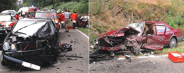 Drei Personen bei Frontalzusammenstoß schwer verletzt (Fotos:Richter)(hr) Drei PKW-Insassen wurden gestern abend kurz nach 19 Uhr bei einem Unfall auf der L 524 zwischen Eberbach und Unterdielbach schwer verletzt. Ein 62-jähriger Waldbrunner geriet mit seinem Mercedes aus Richtung Eberbach kommend in einer leichten Rechtskurve etwa 500 Meter unterhalb des Ortseingangs Unterdielbach auf die Gegenfahrbahn. Dort kollidierte er frontal mit einem ordnungsgemäß entgegenkommenden Mercedes. Dessen 64-jähriger Fahrer wurde bei dem Crash eingeklemmt und schwer verletzt. Er musste von der Freiwilligen Feuerwehr Eberbach befreit und vom DRK ins Krankenhaus eingeliefert werden. Seine 56-jährige Beifahrerin wurde ebenso wie der Unfallverursacher mit schweren Verletzungen stationär im Kreiskrankenhaus Eberbach aufgenommen. Unfallursache war vermutlich Unachtsamkeit, Alkohol war nicht im Spiel. Beide PKW wurden total beschädigt. Die Landesstraße musste während der Bergungsarbeiten in beiden Richtungen für etwa eine Stunde voll gesperrt werden.