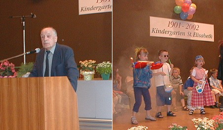 Von der Katholischen Kleinkinderschule zur Katholischen Tageseinrichtung für Kinder Dr.Dieter Röckel bei seinem Festvortrag, rechts die Kinder bei einer fetzigen Rock-Show. (Fotos:Wörner)(tw) "Seit mehr als 100 Jahren ist der Kindergarten St. Elisabeth ein wichtiger Teil im Leben unserer Pfarrgemeinde St. Johannes Nepomuk und unserer Stadt Eberbach", so Kindergartenleiterin Ulrike Kraus in ihrer Begrüßung zum Festakt im Katholischen Pfarrheim anlässlich des über 100-jährigen Bestehens von St. Elisabeth am Freitagabend.
