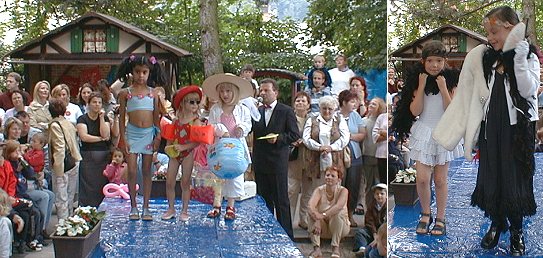 Danach versammelte man sich zum Mittagessen im schön geschmückten Hof des Kindergartens. Für die Kinder gab es zahlreiche Angebote zum Basteln und Spielen. In einer Tombola gab es viele schöne Preise zu gewinnen. Das originelle und nicht ganz einfache Kindergartenpreisrätsel erforderte viel Wissen rund um den Kindergarten. Man konnte sich die Antworten allerdings auch mit einem kleinen Rundgang durch die Räumlichkeiten der Einrichtung erarbeiten. Ein Magnet vor allem für die "Ehemaligen" war die Fotoausstellung. Auf den zahlreichen Bildern versuchte man sich wiederzufinden und konnte mit alten Kinderschulfreunden in Erinnerungen schwelgen. Der absolute Höhepunkt des Nachmittags war die Modenschau. Die kleinen Models führten unter tosendem Beifall wie Profis die neueste Mode aus vergangenen Zeiten vor. Bürgermeister Bernhard Martin bewies absoluten Sachverstand in seiner Moderation der Schau.