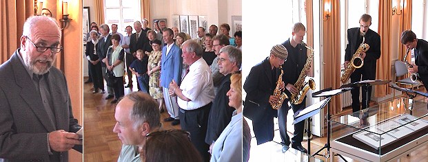Nichts ist beständiger als die Bewegung Zahlreiche Gäste und der Künstler selbst (mittleres Bild ganz rechts) lauschten der Einführung von Hans Gercke (l.) und dem Saxophonquartett "Sax mal anders". (Fotos:Richter)(hr) (ra) Die Vitrinen stehen im goldenen Schnitt zur Breite des Raumes, die Stellwände wurden entfernt. So eröffnen die Architekturstudien des Eberbacher Künstlers Räume in jeder Hinsicht. Am Sonntag wurde die letzte Ausstellung im Rahmen des Stadtjubiläums eröffnet. Das preisgekrönte Ensemble "Sax mal anders" war gerade noch rechtzeitig aus der Champagne angereist, um die Vernissage musikalisch mitzugestalten.