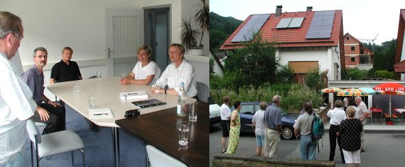 Abschließender Besichtigungspunkt war die erste in Zwingenberg errichtete Photovoltaik-Anlage. Dipl.-Phys. N.Beck, der die Anlage installierte, erläuterte deren Funktion. Der Anlagentyp weise je nach Größe eine Leistung von 1,5 - 5 kWp auf. Der erzeugte Solarstrom werde über einen Wandler direkt in das Netz eingespeist. Das Erneuerbare-Energien-Gesetz (EEG) sichert eine Abnahme über 20 Jahre hinweg zu einem Preis von derzeit 0,48 €/kWh. Die Finanzierung erfolge über das 100.000-Dächer-Programm der Kreditanstalt für Wiederaufbaumit z. Zt. 1,9% eff. Jahreszins.