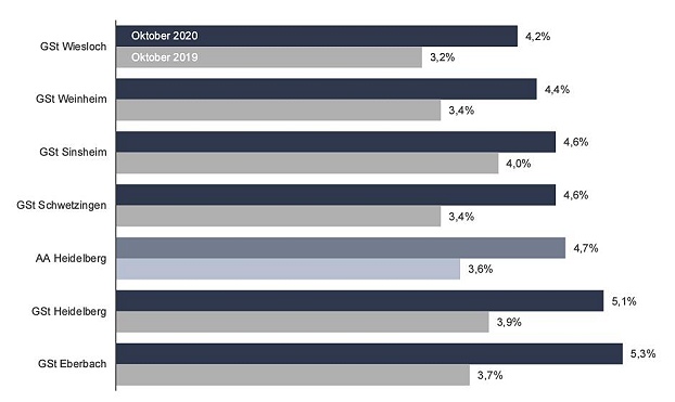 Zum zweiten Mal in Folge ist in diesem Monat die Arbeitslosigkeit zurückgegangen. Der bisherige Jahreshöchststand war im August mit 19.014 Personen erreicht. Verringerte sich die Arbeitslosigkeit von August auf September um 370 Personen, sank sie im Oktober sogar um 628 auf 18.016 Personen. Die Zahl der Menschen, die aus einer Beschäftigung heraus arbeitslos geworden sind, ist im Vergleich zum Vorjahr sogar leicht gesunken. Dagegen hat sich im Vorjahresvergleich die Zahl der Arbeitslosen, die nach ihrer Arbeitslosigkeit direkt wieder eine Beschäftigung aufgenommen haben, um 27 Prozent erhöht. „Die Entwicklung der Zu- und Abgänge in und aus der Arbeitslosigkeit lassen mich hoffen, dass es uns perspektivisch gelingt, die Arbeitslosigkeit, die coronabedingt überdurchschnittlich gestiegen ist, in einem angemessenen Zeitraum auch wieder abzubauen. Vorausgesetzt eine zweite Infektionswelle macht uns hier keinen Strich durch die Rechnung“, sagt Klaus Pawlowski, Chef der Agentur für Arbeit Heidelberg. „Auch der Stellenbestand ist seit Juni kontinuierlich wieder angestiegen. Ungefähr zwei Drittel der bei uns gemeldeten Stellen sind für Fachkräfte. Allein im Handel werden in der Region 500 Mitarbeiter gesucht. Der Bedarf im Gesundheitswesen, vor allem in Arztpraxen und in der Pflege, ist nach wie vor ungebrochen. Auch im Baugewerbe werden händeringend Handwerker und Maschinenführer gesucht. Deshalb verfolgen wir weiterhin die Strategie, jedem Kunden bei Bedarf eine passende Qualifizierung anzubieten“, so Pawlowski weiter
