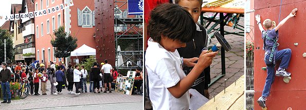 Action & Fun zum Stadtjubiläum (Fotos:Claussen)(jc) Gestern stand die Eberbacher Altstadt ganz im Zeichen des 3. Eberbacher Jugendtages, der in diesem Jahr unter dem Motto: „775 Jahre Eberbach – ne tolle Sach!“ stand. Mehr als 20 Vereine und Organisationen boten Sportaktivitäten, Spiele, Workshops, Musik- und Tanzvorführungen an. Sogar eine Schäferei auf der Wiese am Pulverturm wurde eingerichtet. Ein besonderer Anziehungspunkt war wieder einmal die Kletterwand des THW-Ortsverbandes. Reges Interesse gab auch an der Verlosung. Teilnahmebedingung war das Sammeln von Stempeln auf einer Laufkarte, die man bei den einzelnen Ständen nach Teilnahme an den jeweils gebotenen Aktivitäten aufgedrückt bekam. Auf dem Ephrata- und Lindenplatz wurde mit verschiedenen musikalischen Darbietungen unterhalten. Die Schirmherrschaft der Veranstaltung unter Federführung des Stadtjugendrings hatte Bürgermeister Bernhard Martin übernommen.