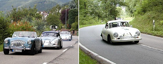 Wertungsprüfung der „Heidelberg Historic“ auf Rennstrecke (Fotos:Claussen)(jc) Im Eberbacher Sprachgebrauch ist die „Rennstreck“ noch immer fest verankert, obwohl die Serpentinenstrecke zwischen Neckarwimmersbach und Schwanheim schon seit Jahrzehnten kein richtiges Automobilrennen mehr gesehen hat. Gestern gab es wenigstens eine Art Wiederbelebung, als die „Heidelberg Historic“ mit einer Wertungsprüfung in Eberbach gastierte. Allerdings würde die Strecke nicht wie in früheren Zeiten üblich für den Verkehr gesperrt. Dies führte bei Zuschauern und Fahrern teilweise zu Unmut, weil die chromblitzenden Veteranen ihre Bergqualitäten teilweise nicht ganz ausspielen konnten, da das eine oder andere High-Tech-Gefährt der Gegenwart nicht mit den Oldtimern Schritt halten konnte und als unfreiwilliger Bremsklotz fungierte. Der Betrachter konnte nur staunen, welch gewaltige Leistung beispielsweise Fahrzeuge aus den dreißiger Jahren auf solch einer Strecke entwickeln können. Insgesamt waren rund 150 Fahrzeuge aus den Jahren zwischen 1932 und 1976 am Start, der am Ortsausgang erfolgte.