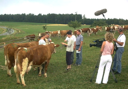 Pferdemarkt beschert Beerfelden dreieinhalb Sendeminuten Für einen langen Drehtag war man in Airlenbach und auf dem Rollehof in Erbach gerüstet, damit der Beerfelder Pferdemarkt im hessen drei fernsehen am Freitag als Hessen-Tipp gesendet werden kann. Das Kamerateam um Reporter Uli Höhmann war von der Organisation in Beerfelden begeistert. Das Foto zeigt das Team bei Dreharbeiten auf dem Hof Schäfer in Airlenbach.(Foto:privat)(tw) (kj) Der Stellenwert des Pferdemarktes zeigt sich auch in diesem Jahr wieder an einem sehr großen Medieninteresse. Neben zahlreichen Presseberichten und den bevorstehenden Live-Sendungen mit hr1 am Samstag zwischen 10 und 15 Uhr neben der Longierhalle, hatte sich in dieser Woche auch das Hessen-3-Fernsehen angesagt. Für sage und schreibe dreieinhalb Sendeminuten galt es am Dienstag den Haupttag, den Pferdemarktmontag, kameragerecht zu präsentieren. Reporter Uli Höhmann, Tontechniker Rainer Schunack, Kamerafrau Sandra Kömpf und Praktikantin Carina Gepphart von der Redaktion Service Hessen Tipp starteten am Morgen mit Aufnahmen in Airlenbach. Auf dem Hof der Familie Schäfer fungierten Christian Zimmermann (Beerfelden) und Walter Siefert (Airlenbach) als Preisrichter für die von Ernst Schäfer und Andre Fichtel vorgeführten Kühe. Danach wurde auf den Rollehof nach Erbach gewechselt, wo Reinhold Eitenmüller (Güttersbach) dem Kamerateam das richten zweier Stuten mit Fohlen von Andreas Müller (Rollehof, Erbach) erläuterte. Nach alter Tradition „verkaufte“ dann Hans Stockum (Rollehof Erbach) an Helmut Trumpfheller (Michelshof, Michelstadt) ein Fohlen per Handschlag – ein Verkauf, der so heute noch rechtlichen Bestand hat. Die weiter geplanten Aufnahmeschwerpunkte, wie das Vorführen eines Rindes durch Marie und Moritz Schäfer (Airlenbach) und die Präsentation eines Hengstes (Rollehof), fielen leider den bis dahin schon umfangreichen Dreharbeiten zum Opfer.