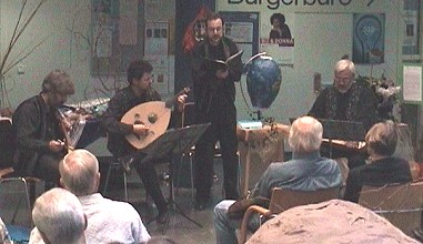Klangvolle Namen wie "Bernart de Ventadorn" oder "Raimbaut de Vaqueiras" erinnerten an die romanischen Vorbilder des Minnesangs, die Welt der Troubadours und Trouvères. Nun war der Minnesang immer schon wörtlich zu nehmen, als gesungene Lyrik, doch leider sind zu den meisten Dichtungen die Melodien nicht überliefert. Somit kann das Erklingen von "Musik aus dem Mittelalter" heute nur eine Annäherung sein, freilich im Fall des Ensembles "I Ciarlatani" eine seriöse und wohl fundierte. Dies beginnt schon bei der Auswahl und Bauart der Instrumente. Klaus Winkler blies eine näselnde Dolzaina oder eine Sackpfeife (Dudelsack), Johannes Vogt zupfte eine Laute und Russ Hodge wechselte zwischen Rebec und Fiedel, zwei Streichinstrumenten, die schon vor den Gamben da waren. Armin Gottstein sang die Texte in mittelhochdeutscher Sprache, in Liebesliedern einfühlsam und kultiviert, in Trinkliedern auch komödiantisch überzeichnet.