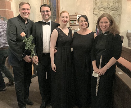 Dabei wechselten sich die strahlenden Sopranstimmen von Dorothea und ihrer Tochter Felicia Metternich mit der warmen Tenorstimme von Günther HuĂźlik ab, manchmal wurde duettiert, oft erhoben sich Carola Schäffners Flötentöne über die Kantilenen. Dazwischen verlas Schauspieler und Regieassistent Christian Metternich fesselnd Gedichte, die den roten Faden durch den Abend weiterführten. Natürlich durften dabei groĂźe deutsche Dichter wie Heine und Goethe nicht fehlen. Dies waren die wenigen Momente, zu denen das Klavier von Agnes Heilmann schwieg, welches sonst jedoch auffällig gekonnt in Klangfarbe und Stilistik zwischen den jeweiligen Epochen vom Barock bis zur Moderne differenzierte.