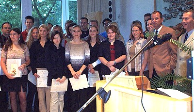 148 Schüler von Theodor-Frey-Schule verabschiedet (Foto:Jackson)(jc) Bei der gestrigen Abschlussfeier an der Theodor-Frey-Schule wurden insgesamt 148 Absolventen der Kaufmännischen Berufsschule, der Wirtschaftsschule und der Berufskollegs verabschiedet. Dabei kamen folgende Schülerinnen und Schüler in den Genuss von Auszeichnungen (Gesamtnote in Klammern).