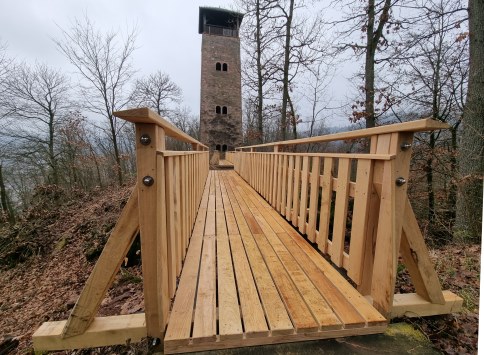 Nachdem die beiden bisherigen Holzbrücken im Frühjahr 2021 aus Sicherheitsgründen gesperrt und im Herbst endgültig abgebaut wurden, hat die Firma Wagner Energieholz zwei neue Brücken geliefert und in den vergangenen Tagen montiert. Damit ist der Turm nun auch wieder über den Bergrücken aus nordöstlicher Richtung zu Fuß erreichbar. Die neuen Brücken sind aus witterungsbeständigem Robinienholz gefertigt, und als Unterbau wurden verzinkte Stahlträger gewählt. Die Brücken überspannen die beiden historischen Ringgräben am Gipfelplateau des Ohrsbergs. Die Gräben wurden vermutlich im Mittelalter zum Schutz einer kleinen Burganlage auf dem Ohrsberg in Handarbeit angelegt.