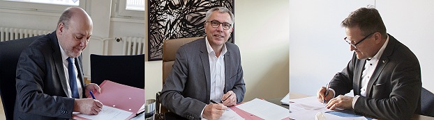 Startschuss für Freiräume Bürgermeister Frank Volk, Landrat Stefan Dallinger und Bürgermeister Peter Reichert haben gestern die Kooperationsvereinbarung für das gemeinsame Projekt "Freiräume" unterzeichnet. (Fotos: privat)(bro) (sh) Am Mittwoch, 19. Januar, hat der Landrat des Rhein-Neckar-Kreises, Stefan Dallinger, gemeinsam mit dem Eberbacher Bürgermeister Peter Reichert und dem Neckargemünder Bürgermeister Frank Volk eine Kooperationsvereinbarung für das gemeinsame Projekt "Freiräume" unterzeichnet.