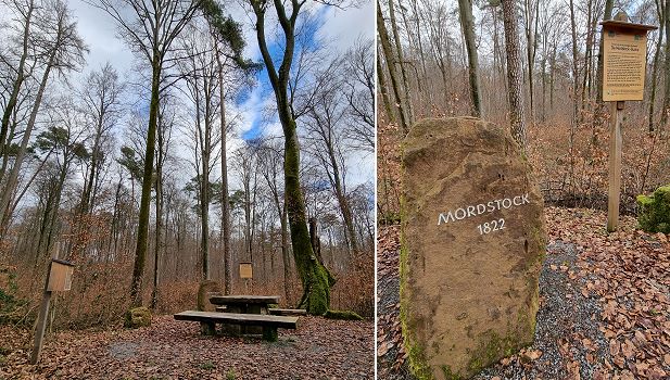 Gedenkstätte erinnert an eine grausame Bluttat (Fotos: Hubert Richter)(hr) An einen mysteriösen Mordfall erinnert ein Rastplatz mit Gedenkstein an einer alten Buche im Wald bei Neunkirchen.