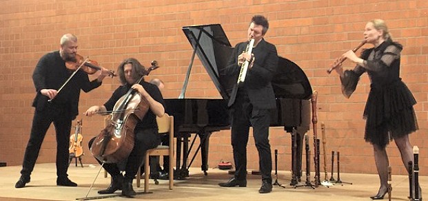 Andrea Ritter und Daniel Koschitzki bringen mit ihrem groĂźen Sortiment an Blockflöten ganz unterschiedliche Klangfarben zu Gehör. Mit ihnen verbinden sich die Violine bzw. Viola von Stefan Balazsovics und das Violoncello von Victor Plummetaz. Mit Christian Fritz am Flügel präsentierten die fünf Musiker dem Eberbacher Publikum ihr aktuelles Programm „Bach - Berio - Beatles“.