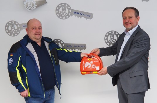 Bürgerstiftung spendet Gerät zur Lebensrettung Vorstandsvorsitzender Frieder Reichert von der Bürgerstiftung (r.) übergibt den Defibrillator an den THW Ortsbeauftragten Markus Haas. (Foto: Alessandro Silvestri)(hr) (as) Der THW Förderverein Eberbach e.V. freut sich über die Spende eines Defibrillators. Finanziert wurde das Gerät von der Bürgerstiftung Eberbach.
