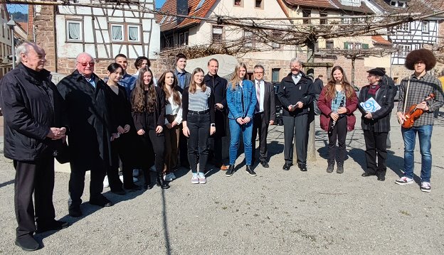 Durch die Vorstellung des Digiwalks führte Pfarrer Gero Albert. Grußworte sprachen als Vertreter des Bürgermeisters Stadtrat Wolfgang Kleeberger, Prof. Klaus Müller, Vorsitzender der Konferenz Landeskirchlicher Arbeitskreise Christen und Juden, und Hans Wipfler, der vor einigen Jahren das Mahnmal auf dem Synagogenplatz in Zusammenarbeit mit Schülerinnen des Hohenstaufen-Gymnasiums gestaltet hatte. Alexander Bartmann, Mitglied der Eberbacher Arbeitsgruppe, las das Gedicht „Anne“ von Rahel Mann aus der Sammlung „Das Ewige im Menschen“. Musikalisch umrahmt wurde die Vorstellung von Tanja Wilbrandt, Klarinette, und Seyram Agnave, Violine, begleitet von Gero Albert am Klavier.