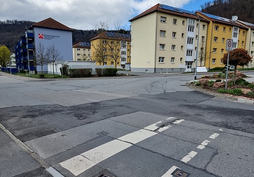 Fehlende Radwegplanung in Pestalozzi- und Berliner Straße (Foto: Hubert Richter)(hr) Für die Sanierung der Einmündung Pestalozzistraße/Berliner Straße gibt es noch keine fertige Planung. Das Thema wurde in der letzten Gemeinderatssitzung ohne Abstimmung vertagt.