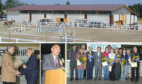 Reitverein Hoher Odenwald feierte Jubiläum mit neuer Reitanlage Unsere Fotos zeigen die neue Reithalle mit Springparcours und (v.l.) Bürgermeister Klaus Schölch bei Gratulation an Vorsitzende Gertrud Demel, Heinz Janalik, Präsident des Badischen Sportbundes bei seinen Grußworten und die geehrten Mitglieder des Reitclubs Hoher Odenwald Waldbrunn. (Fotos:Baumgartner)