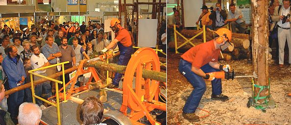 Forstamt Schwarzach demonstrierte sicheres Arbeiten mit der Motorsäge Links eine Vorführung am Spannungssimulator, rechts der Fällsimulator. (Fotos:Forstamt Schwarzach)(hr) Unter dem Motto "Gemeinsam für mehr Sicherheit" haben die Forstdirektion Freiburg, die Hauptstützpunkte Schwarzach und St. Märgen zusammen mit der Landwirtschaftlichen Berufsgenossenschaft Baden-Württemberg, dem Badischen Gemeindeunfallversicherungsverband und der Sächsischen Waldarbeitsschule Morgenröthe einen Teilbereich der Sonderschau bei der Messe INTERFORST vom 3. bis 7. Juli in München gestaltet.