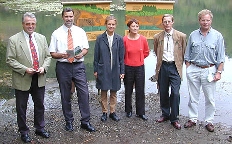 Neues Prospekt für den Weg der Kristalle vorgestellt Unser Foto zeigt v.l. Bürgermeister Klaus Schölch, Landrat Detlef Piepenburg, Frau Henn (Naturpark Neckartal-Odenwald), Frau Schölch-Stephan (Arbeitskreis Tourismus-Freizeit-Erholung), Diplom-Mineraloge Dr. Andreas Landmann, Hannes Melchinger (Naturpark Neckartal-Odenwald) bei der Vorstellung des Flyers "Weg der Kristalle". (Foto:Baumgartner)(tb) Schon im Sommer 2000 wurde von der Firma "Mineralogisches Büro Dr. Landmann" gemeinsam mit dem Arbeitskreis Touristik Waldbrunn und der Gemeinde Waldbrunn die Anlegung eines geologischen und mineralogischen Lehrpfads am Waldbrunner Katzenbuckel, der höchsten Erhebung im Odenwald, initiiert. Das Konzept und der wissenschaftliche Inhalt des Lehrpfads wurde dann von Dr. Andreas Landmann ausgearbeitet, die Umsetzung in Form von Schildern an den neun Lehrpfadstationen erfolgte in enger Zusammenarbeit mit dem Naturpark Neckartal–Odenwald. Die Projektkoordination lag bei der Gemeinde Waldbrunn, das Aufstellen der Schilder wurde vom Bauhof der Gemeinde Waldbrunn übernommen.