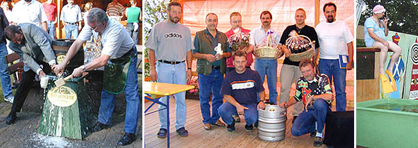 Abends folgte dann mit „der Ortschaftsrat geht Baden“ eine feuchtfröhlich Unterhaltung, bei dem der Ortschaftsrat, 5 Tennisbälle und jede Menge Werfer die Hauptrolle spielten. Ein Mitglied des Ortschaftsrates saß auf einem Balken, der mechanisch gekippt werden konnte. Für 50 Cent Einsatz durfte jeder 5 Bälle auf eine Zielscheibe mit einem Loch in der Mitte werfen. Wurde in die Mitte getroffen, so wurde die Mechanik ausgelöst und der auf dem Balken sitzende Ortschaftsrat fiel ins Wasser. Bereits beim zweiten Ball war Ortsvorsteher Peter Ihrig klatschnass. In kurzen Abständen folgten ihm seine Mitstreiter ins kühle Nass.