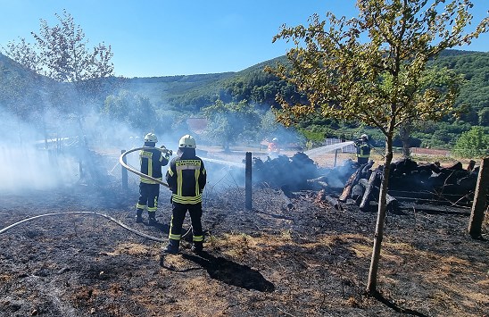Etwas später in Pleutersbach (unser Bild) war es ein 80 Jahre alter Mann, der auf seinem Grundstück mehrere Eimer Baumschnitt verbrannte und dann selbst einen Notruf absetzte, nachdem sich das umgebende trockene Gras entzündete. Das Feuer griff schließlich noch auf einen Holzstapel, Zaunelemente eines Gartengrundstücks und einen Kirschbaum über. Der entstandene Sachschaden wird auf rund 2.500 Euro geschätzt. Verletzt wurde bei dem Brand niemand.