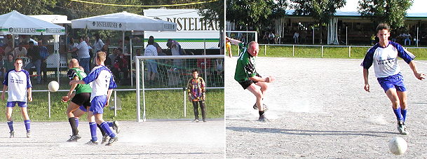 Allemühl gewinnt erstes Fanclub- und Hobbyturnier Endspielszenen (Fotos:Claussen)(jc) Der Fanclub der Mannheimer DEL-Eishockeymannschaft "Adler Mannheim" veranstaltete am vergangenen Samstag auf dem Hartplatz in der Au sein erstes Fanclub- und Hobby-Fußballturnier. Das Turnier wurde von der Mannschaft aus Allemühl gewonnen, die im Endspiel ein Team aus Waldsee mit 2:0 besiegte. Für das große Festzelt, das am Sportgelände aufgebaut war, konnten die "Adler-Freunde" die Eberbacher Band "Steampowered Aeroplane" für einen abendlichen Auftritt am Samstag gewinnen. Die Einnahmen der Veranstaltung, die am Sonntag mit einem Frühschoppen bei Musik der Feuerwehrkapelle Neckargerach, sowie Kinder-Ferienspielen "Rund ums Eishockey" ausklang, sollen krebskranken Kindern zugute kommen.