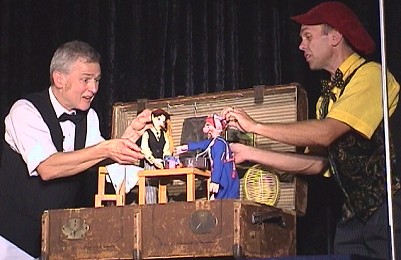 Die Blinklichter Wolfgang Messner und Werner Ries vom Blinklichter-Theater aus Rot führten eine besondere Inszenierung des Grimm'schen Märchens auf. Verkleidet oder mit selbst hergestellten Figuren schafften sie es in kürzester Zeit, dass alle Zuschauer mitmachten, als Bäume, Vögel oder Wölfe. Ja selbst ein röhrender Hirsch fand sich zwischen den Erwachsenen. Ein Höhepunkt war sicher die Wildschweinjagd, die im Publikum stattfand. Das Blinklichter-Theater, das es seit etwa zehn Jahren gibt, spielt zu 80 Prozent Stücke für Kinder zwischen drei und zwölf Jahren, die sich mit den verschiedensten gesellschaftlichen Trends und sozialen Problemen befassen.