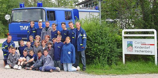 Caritas-Kinderdorfs Irschenberg. Die verantwortlichen Jugendleiter waren Mathias Hodbod (l.), Marc Gerhard (r.) und Michael Sommer (hinten links). (Foto:privat)(bm) (wh) Groß war die Freude bei den Kindern und Jugendlichen des Caritas-Kinderdorfes, als die THW-Jugendgruppen aus Eberbach und Neunkirchen mit über 20 Mann und vier Fahrzeugen in Irschenberg (Oberbayern) eintrafen.