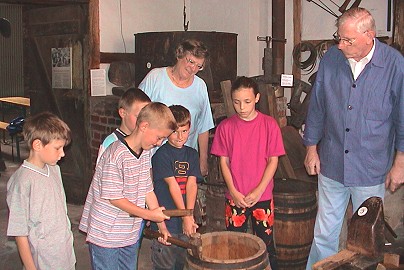Ferienkinder im Küferei-Museum Friedel und Werner Helm erklärten den Kindern das alte Handwerk der Küferei. (Foto:C.Richter)(hr) Handwerklich ging es heute im Eberbacher Ferienspaß zu: Die Kinder trafen sich im Küferei-Museum im Pfarrhof. Friedel und Werner Helm, in deren Haus das private Museum eingerichtet ist, luden die Kids zu einer Führung in die Ausstellungsräume ein, um hier Interessantes über die Herstellung eines Holzfasses zu berichten. Nicht nur Zuhören war angesagt, die Kinder durften selbst einen echten Holz- Blumenkübel herstellen. Erstaunt waren die kleinen Handwerker darüber, wie man das Holz bearbeiten muss und wieviel Zeit es kostet, bis man letztendlich ein Holzfass fertiggestellt hat. Zum Schluss der Veranstaltung schenkte die Familie jedem Kind ein Original "Küferei-Museums-Glas", natürlich gefüllt mit Apfelsaft.