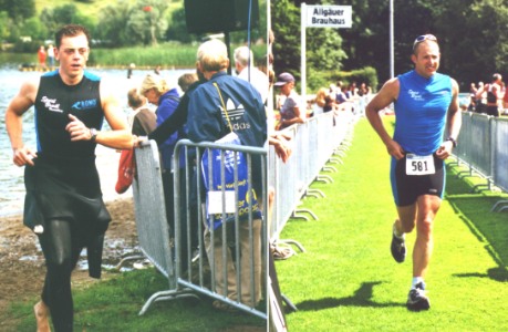 Diese wurden im Rahmen des 20. Internationalen Allgäu Triathlon in Immenstadt durchgeführt. Insgesamt 923 Triathleten waren am Wettkampftag vor Ort, darunter auch zahlreiche Profis und Teilnehmer aus anderen Nationen. Die Wettkampfstrecke zählt zu den Schwierigsten im Triathlon. Gestartet wurde im Großen Alpsee bei Immenstadt, wo eine Schwimmstrecke von 2 Kilometern zurückzulegen war. Um sich vor dem 18 Grad kalten Wasser zu schützen wird mit einem Neoprenanzug geschwommen. Danach folgte das Radfahren über 92 Kilometer durch das schöne, aber auch bergige Allgäu. Insgesamt musste ein Höhenunterschied von über 1200 Metern überwunden werden. Höhepunkt der Radstrecke ist der Kalvarienberg in Immenstadt, dort finden sich jedes Jahr mehrere Tausend Zuschauer ein um die Athleten lautstark anzufeuern, die dort einen 600 Meter langen Anstieg mit 16 Prozent Steigung zu überwinden haben. Nach der anspruchsvollen Radstrecke blieb den Triathleten aber keine Zeit zum Ausruhen, bevor sie die Ziellinie im Auwaldstation überqueren konnten, mussten noch zwei Laufrunden über insgesamt 21 Kilometer zurückgelegt werden. Bei Temperaturen von über 30 Grad musste hier jeder an seine Grenzen gehen. Trotz der schwierigen Wettkampfstrecke und dem hochkarätigen Starterfeld konnten die zwei Teilnehmer des TV Eberbach sehr gute Platzierungen in ihren Altersklassen erkämpfen. Florian Uhrig der zum ersten mal in Immenstadt am Start war, übertraf alle Erwartungen und belegte hier mit einer Gesamtzeit von 5 Stunden und 22 Minuten den 21. Platz. Gleich zu Beginn des Wettkampfs konnte er von seinen guten Trainingsleistungen profitieren und stieg nach 30 Minuten aus dem Wasser, womit er bereits über 850 Athleten hinter sich ließ. Auf der Radstrecke konnte er einen sensationellen Schnitt von 30 km in der Stunde fahren und benötigte für den 92 Kilometer langen Streckenabschnitt nur 3 Stunden. Mit einer Laufzeit von 1:50 Stunden konnte er seine sehr gute Position verteidigen und überquerte erschöpft, aber auch erfreut über seine Leistung die Ziellinie. Boris Müller, der zum dritten mal in Immenstadt am Start war, konnte mit einer sehr guten Gesamtzeit von 6 Stunden und 4 Minuten den 66. Platz in seiner Wertung belegen. Als 558. kam er nach 39 Minuten aus dem Wasser. Für die Radstrecke benötigte er 3:20 Stunden und konnte sich mit dieser sehr guten Leistung einige Plätze nach vorne schieben. Mit einer Laufzeit von 2 Stunden beendete auch er zufrieden die Deutschen Meisterschaften im Triathlon auf der Mitteldistanz.