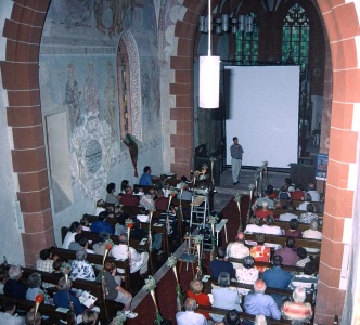 Über 300 faszinierte Zuschauer bei der Video-Live-Übertragung in der Ersheimer Kapelle Blick von der Empore der Ersheimer Kapelle während des Diavortrags von Dirk Bernd.(Foto:G.Löffler)(tw) (db)Am Samstag, 27.Juli 2002 veranstaltete die Arbeitsgemeinschaft Fledermausschutz in Hessen (AGFH) zusammen mit dem NABU-Bergstraße und dem NABU-Eberbach sowie der Katholischen Kirche und der Stadt Hirschhorn in der Ersheimer Kapelle in Hirschhorn eine Video-Live-Übertragung über das Leben der dort im Dachstuhl lebenden Fledermäuse. Dieses einmalige Erlebnis, um die im verborgen lebenden Tiere aus nächster Nähe zu beobachten, teilten an diesem Samstagabend über 300 erstaunte und faszinierte Gäste. Viele von ihnen hatten weite Anfahrten nicht gescheut, um die größte Fledermaus-Fortpflanzungskolonie (Wochenstubenkolonie) live und zum Greifen nah zu beobachten. Über die große Leinwand im Kapellenraum waren die Aufnahmen von vier Infrarot-Videokameras, die Herr Karl Kugelschafter (Abteilung Wildbiologie Universität Gießen) zuvor im Dachraum der Kapelle montiert hatte, zu sehen. Aus nächster Nähe sah man die Fledermäuse kopfüber in dichten „Trauben“ an der Decke hängen, sich putzen, ihr Junges säugen und wie sie vor dem Ausflug umher schwärmen und schließlich aus der Ausflugöffnung ins Freie fliegen.