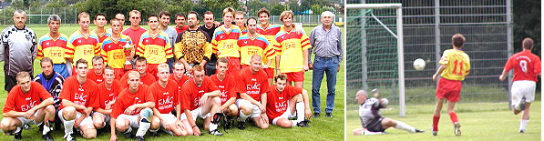 Ittertäler schlagen Neckartäler Cup-Gewinner ISV Kailbach (gelbe Trikots) und der unterlegene SV Zwingenberg (rote Trikots), Florian Bachl erzielt das Tor des Tages (rechts) (Fotos:Claussen)(jc) Die ISV Kailbach gewann heute das Endspiel des 10. Neckartal-Cups gegen den SV Zwingenberg mit 1:0. Das goldene Tor erzielte Florian Bachl in der zweiten Halbzeit, nachdem das Team aus dem Ittertal über weite Strecken das gefälligere Spiel gezeigt hatte. Die Zwingenberger kamen erst nach dem Rückstand besser ins Spiel und hatten in der Endphase noch einige Großchancen. VfB-Vorsitzender Joachim Scheible resümierte bei der Pokalübergabe, das Turnier sei wie in jedem Jahr verlaufen. Man habe wenige Zuschauer und schlechtes Wetter gehabt. Der Sieger konnte sich über ein Preisgeld von 200 Euro freuen, der Unterlegene konnte immerhin 100 Euro mitnehmen.