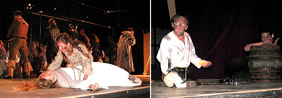 Diesmal spielte auch das Wetter mit Links:Die „weiße Taube“ Agathe ( Hanna Dóra Sturludóttir, am Boden) und Ännchen (Britta Wieland), rechts:Kaspar (Marek Gasztecki) und Max (Gilbert Mata,rechts) in der Wolfsschluchtszene (Fotos:Festspiele)(jc) Die Premiere der Zwingenberger Haus-Oper "Der Freischütz" war gestern Abend vor 600 Zuschauern ein voller Erfolg. Nachdem am Vortag die Premiere des "Figaro" noch wegen schlechten Wetters abgebrochen werden musste, konnten Zuschauer und Veranstalter gestern zufrieden nach Hause gehen.Die Verantwortlichen bieten nun am kommenden Montag, 12. August, um 20 Uhr eine Ersatzvorstellung des „Figaro“ an. Sollte das Wetter weiter mitspielen, geht heute um 20 Uhr die planmäßige Vorstellung der „Hochzeit des Figaro“ über die Bühne. Die Karten vom Freitag behalten ihre Gültigkeit für den Montag. Außerdem gibt es weitere Karten in allen Kategorien an der Abendkasse. Informationen und Bestellungen sind beim Festspielbüro, Telefon (06263)771, Fax 772 möglich.
