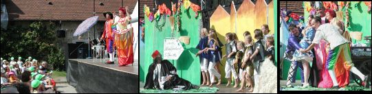 Haydn für Kinder (Fotos: Festspiele)(lf) (sb)Rund 250 Besucher, überwiegend Familien mit Kindern, erlebten am Samstag eine bunte, kindgerechte Inszenierung von Joseph Haydns Oper "Die Welt auf dem Monde". Während der Text stark verändert war (der gefräßige Moppel wünschte sich eine Riesentüte "Pommes mit Mayo"), waren die Arien Haydn. Die Bilder zeigen das Ensemble am Ende der Komödie - alles geht natürlich gut aus, das Mondballett, das sich aus Kindern der Region zusammensetzte und hier dem reichen Herrn