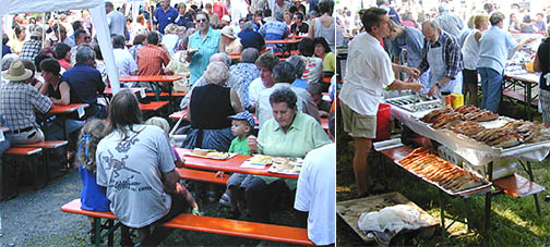550 fangfrische Forellen fanden Absatz Riesenandrang herrschte beim diesjährigen Seefest in Waldkatzenbach, bei dem auch wieder 550 fangfrische Forellen - geräuchert oder gebacken - reißenden Absatz fanden. (Fotos:Baumgartner)(tb) Zum 19. Seefest rund um den Katzenbuckelsee luden heute der Sportangelverein Katzenbuckelsee und die DLRG-Ortsgruppe Waldbrunn die Bevölkerung Waldbrunns und der näheren Umgebung ein. Herrliches Sommerwetter war in diesem Jahr dem Fest wieder beschieden. So freuten sich die Veranstalter, dass schon zum Start des Seefestes nach den Gottesdiensten sich die Bankreihen bis gegen Mittag auf dem zum Festplatz umfunktionierten Parkplatz am Katzenbuckelsee bis fast auf den sprichwörtlichen letzten Platz füllten. Glück hatte hier, wer rechtzeitig kam und einen Sitzplatz ergattern konnte. Reißenden Absatz bei dem Seefest, welches aus dem Waldbrunner Veranstaltungskalender nicht mehr wegzudenken ist, fanden die über Waldbrunns Grenzen hinaus bekannten guten fangfrischen Forellen, die gebacken oder geräuchert angeboten wurden. Rund 550 Stück hatten die Veranstalter in diesem Jahr binnen kürzester Zeit an den Mann bzw. die Frau gebracht. Auch für die Kinder war man bestens vorbereitet. So gab es für sie einen Luftballonwettbewerb, und natürlich war auch wieder die Hüpfburg aufgebaut. Mittags bot man zusätzlich noch Schlauchbootfahrten auf dem Katzenbuckelsee an.
