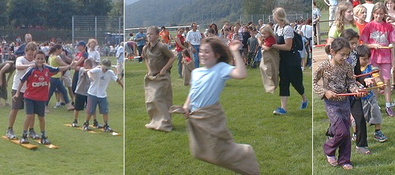 Run auf Kuckucksmarkt-Gutscheine und Geschenke (Fotos:C.Richter)(hr) (cr) Ein voller Erfolg war gestern wieder das Kinderfest beim Kuckucksmarkt. Früher als offiziell eingeladen fanden sich schon zahlreiche Kindern mit ihren Eltern, Großeltern und anderen Erwachsenen zum Anfeuern auf dem Sportgelände in der Au ein. Um 14.30 Uhr waren die Mitarbeiterinnen und Mitarbeiter der Stadtverwaltung und der Stadtwerke mit viel Elan mittendrin, den vielen Starterinnen und Startern die Spielbedingungen zu erklären, Startsignale zu geben und vor allem die begehrten Gutscheine und Geschenke zu verteilen. Bereits gegen 15.30 Uhr waren die meisten Stände "abgeräumt" und die Besucher wanderten verschwitzt, aber glücklich auf das Kuckucksmarktgelände, um dort endlich ihre Preise abzuholen. Auch die vielen Helferinnen und Helfer wirkten zufrieden über das sehr gelungene Fest.