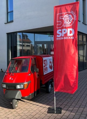 SPD-Infostand rund um den roten Flitzer  (Foto: privat)(bro) (bi) Zu ihrem 50. Geburtstag hat sich die SPD Rhein-Neckar eine besondere Aktion einfallen lassen: Mit ihrer roten Jubiläums-Ape, einem kleinen italienischen Nutzfahrzeug, wird über das Jahr verteilt einmal in jeder einzelnen Gemeinde des Rhein-Neckar-Kreises Halt gemacht und zu bunten Aktionen eingeladen. So auch in Eberbach, wo sich der SPD-Ortsverein und die Gemeinderatsfraktion am kommenden Samstag, 17. Juni, auf dem Thononplatz mit einem Infostand rund um den roten „Flitzer“ präsentieren möchte.
