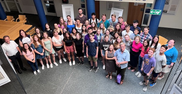 21 junge Menschen der amerikanischen Partnerstadt begrüßt Bürgermeister Peter Reichert mit den Austauschschülerinnen und -schülern, den amerikanischen Lehrerinnen Lisa Brimhall und Amanda Nace, Johannes Ferencik (Lehrer HSG) und Reiner Heun, dem Vorsitzenden des Vereins Freundeskreis Ephrata im Foyer des Rathauses. (Foto: Stadt Eberbach)(bro) (stve) Seit 15. Juni sind 21 Schülerinnen und Schüler im Alter von 14 bis 17 Jahren aus der amerikanischen Partnerstadt Ephrata samt den Lehrerinnen Lisa Brimhall und Amanda Nace zu Besuch in der Stauferstadt Eberbach. Sie wohnen bei ihren jeweiligen Austauschschülern und nehmen auch am Unterricht des Hohenstaufen-Gymnasiums (HSG) teil. Am vergangenen Montag besuchten sie alle gemeinsam die Ausstellung im Foyer des Rathauses „Conrad Beissel – neue Heimat Pennsylvanien“. Anschließend wurden sie samt ihren Lehrerinnen und Johannes Ferencik (Lehrer HSG) von Bürgermeister Peter Reichert im Horst-Schlesinger-Saal empfangen. Mit dabei auch Reiner Heun, Vorsitzender des Vereins Freundeskreis Ephrata.