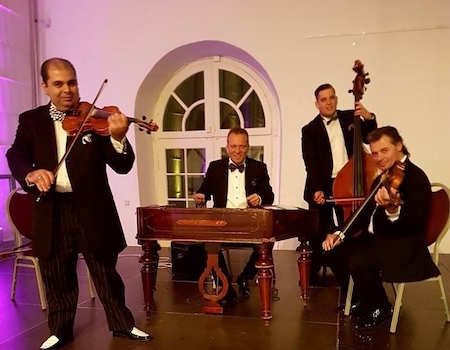 Ungarische Formation entfacht zum Auftakt musikalisches Feuer (Foto: Agentur)(bro) (je) Die Weltmusik hat unter der Intendanz von Rainer Roos bei den Schlossfestspielen Zwingenberg einen festen Platz bekommen. Schon traditionell starten die Festspiele deshalb mit zwei Abenden in lockerer Atmosphäre an Stehtischen im kleinen Schlosshof. Diese Tradition wird auch im Jubiläumsjahr am Freitag, 14., und Samstag, 15. Juli, fortgesetzt, und zwar mit der ungarischen Gruppe „Budapest Night“, einer Formation mit Violine, Klarinette, Gitarre, Cimbalom sowie Kontrabass.