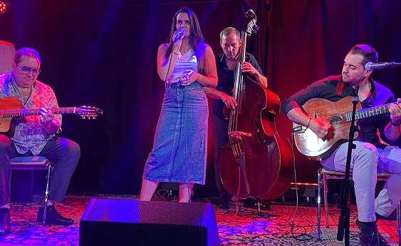 Schwester von Gismo als Special Guest  (Foto: Bianca Weber-Götzenberger) (bwg) Am vergangenen Samstag, 1. Juli, spielte das Gypsy-Swing Trio um Gizmo Graf im Depot 15/7, unter Organisation des Kulturlabors Eberbach, auf.