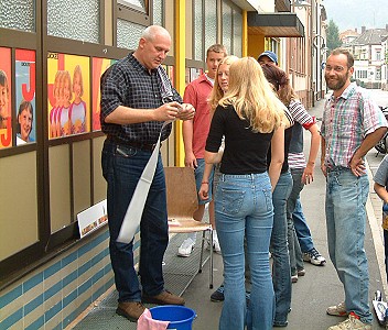 Ferienspaß beim Evangelischen Jugendtreff Werbemanager Bernd Grove (l.) und Pfarrer Ekkehard Leytz (r.) mit engagierten Jugendlichen bei der Anbringung ihrer Selbstporträts, die im Rahmen des Eberbacher Ferienprogramms entstanden sind. (Foto:Böhm)(ub) Gestern trafen sich am "Dicken J" in der Bussemerstraße begeisterte Kinder und Jugendliche, die bei der Ferienspielaktion "Digitale Bildbearbeitung" unter der Leitung von Bernd Grove und Pfarrer Ekkehard Leytz mitgemacht haben. Unter fachkundiger Leitung von Werbemanager Bernd Grove erlernten zwei Gruppen von insgesamt 30 Jugendlichen an zwei Samstagen die digitale Bildbearbeitung. Der Kreativität waren keine Grenzen gesetzt. Bunte Selbstporträts der 10 bis 16 Jahre alten, sehr engagierten Jugendlichen wurden auf UV- beständige PVC-Folie gezogen. In den nächsten drei Jahren werden die laminierten Bilder die Hausfassade des evangelischen Kindergartens zieren. Der von den Teenies selbst kreierte Name "Dickes J", so Pfarrer Leytz, stehe für Jugend und Jesus. Für das künftige Engagement des evangelischen Jugendkreises von Ekkehard Leytz spendete der Lionsclub Eberbach seine Erlöse des diesjährigen Frühlingsfestes. Als Spende des Lionsclub Eberbach überreichte Bernd Grove eine hochwertige Digitalkamera an Pfarrer Leytz und wünschte dem Jugendkreis viel Erfolg bei der künftigen Jugendarbeit.
