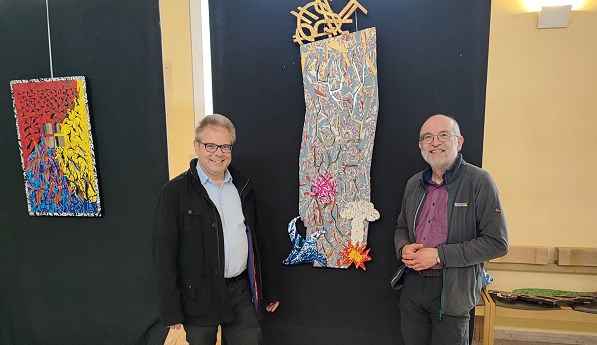 Höhen und Tiefen - Werke von Reinhard Frank Reinhard Frank (r.) und Pfarrer Gero Albert. (Foto: Claudia Richter)(cr) (ga) Im Rahmen der Sommerausstellung in der evangelischen Michaelskirche werden ab dem kommenden Wochenende bis zum 3. September 2023 unter dem Titel „Höhen und Tiefen“ Werke von Reinhard Frank ausgestellt.