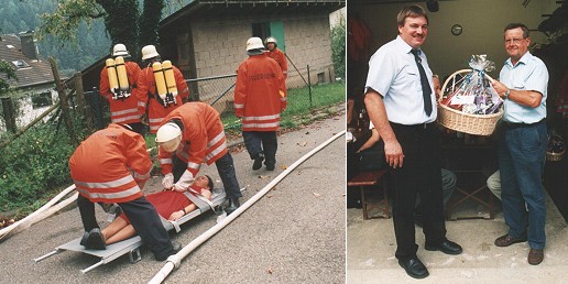 Lindacher Wehr bewies hohen Leistungsstand Die Wehrmänner bei der Menschenrettung. Rechts die Ehrung Werner Helms (r.) durch Kommandant Achim Helm. (Fotos:Wartner)(hr) (ewa) Wie wichtig es ist, im Ernstfall sofort zu wissen, was zu tun ist, zeigte sich erst jüngst bei den Hochwasserkatastrophen in Mittel- und Süddeutschland. Besonders schnell reagieren muss aber die Feuerwehr, wenn es brennt. Ihre alljährliche Hauptübung ist deshalb ein wertvoller Test. Die Mannen der Lindacher Abteilungswehr haben ihn kürzlich mit Bravour gemeistert. Unter den kritischen Augen vieler Zuschauer, darunter der stellvertretende Gesamtkommandant der FFW Eberbach Lothar Zimmermann, Rainer Menges von der Stadtverwaltung, der Grüße von Bürgermeister Martin überbrachte, Gemeinderat Marcus Deschner und Ortsvorsteher Wolfgang Brenneis.