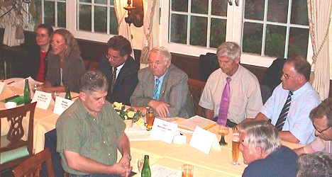 Gewerkschafter baten die Kandidaten zur Talk-Runde V.l. Elgin Fischbach (PDS), Silvia Kotting-Uhl (Bündnis 90/Die Grünen), Walter Spitaler (FDP), Hans Dahlke (DGB), Prof.Gert Weisskirchen (SPD) und Ernst Straub (CDU Eberbach). (Foto:Richter)(hr) Am Freitagabend hatte der Deutsche Gewerkschaftsbund (DGB) die Bundestagskandidaten zu einem Vorstellungs- und Diskussionsabend ins Eberbacher Gasthaus "Karpfen" geladen. Gekommen waren gut 20 Zuhörerinnen und Zuhörer sowie die Kandidaten von SPD, FDP, Bündnis 90/Die Grünen und PDS. CDU-Kandidat Bernd Schmidbauer ließ sich vom Eberbacher Vorsitzenden des CDU-Ortsverbands, Ernst Straub, vertreten. Moderiert wurde der Abend vom Vorsitzenden des DGB-Ortskartells, Hans Dahlke. Dieser gab zu Beginn mit einem Statement der Gewerkschaften das zentrale Thema vor: Der DGB sei für den Erhalt der Arbeiterrechte und gegen eine Zersplitterung der Sozialversicherung.