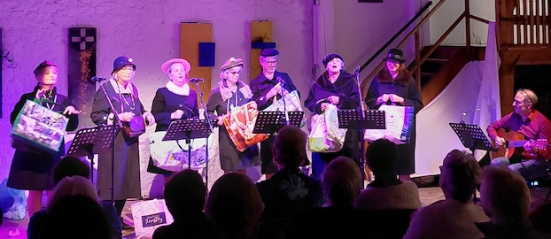 Es geht einmal um die alltäglichen und menschlichen Themen in den vorgetragenen Liedern, die alle immer auch humorvoll moderiert werden. Etwa um die Schwierigkeiten, sich Zahlen, Pinnummern, Passwörter und ähnliches zu merken, beim Lied „IBAN, die Schreckliche“ auf die Melodie des russischen Volkslieds „Kalinka“. Und aus den „sieben Brücken“, über die man gehen muss beim bekannten Song von Karat, wurden an diesem Abend die „sieben Treppen“. Diese und viele Probleme mehr muss man nämlich oft erst bewältigen bei der Deutschen Bahn an ihren Bahnhöfen, damit es am Ende dann heiĂźt beim Fahrkartenautomaten: „Aber glaub`nur net, du kriegst en` Schein!“. Die Damen wussten natürlich auch, dass der Schienenersatzverkehr den Menschen in Eberbach und im Neckartal das Zugfahren gerade ziemlich verleidet. Was viele Lacher, auch hörbar verzweifelte, zur Folge hatte.