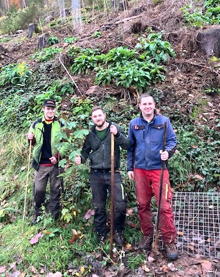 Mitarbeiter der Firma „WaldPlus“ setzten dort insgesamt fast 4.500 neue Bäume. Hier wächst jetzt ein Mischwald, in dem – neben der bereits vorhandenen Naturverjüngung – noch 19 verschiedene Baumarten gepflanzt wurden, die mit Hitze und Trockenheit besser zurechtkommen als Fichten und Buchen. Auch die Pflanzen aus dem „Eberbacher Klimawäldchen“ vor dem Rathaus fanden hier ihre neue Heimat. Bei bestem Pflanzwetter, also teilweise bei strömendem Regen, wurden Löcher in den steilen und steinigen Boden gegraben, um den Wald für „unsere Enkel“ zu pflanzen.