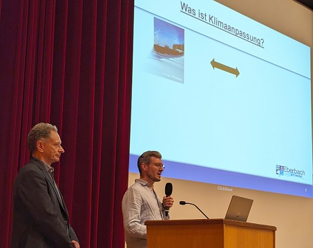 Umgang mit den unvermeidlichen Folgen des Klimawandels Dr. Raino Winkler (l.) und Christian Throm gestalteten einen informativen Abend. (Foto: Hubert Richter)(hr) Mit den Folgen des Klimawandels beschäftigte sich ein Informationsabend, den Dr. Raino Winkler vom Umweltamt der Stadt Heidelberg und Christian Throm vom Klimaschutzmanagement Eberbach gemeinsam am 21. November in der Stadthalle gestalteten.