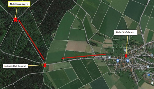 Zum Christbaum im “Heiligen Wald” gelangt man, wenn man von der evangelischen Kirche Schönbrunn der Hainbuchenstraße folgt bis an den Waldparkplatz “Im Höchsten“. Von dort aus zu Fuß halbrechts den Waldweg entlang bis zur T-Gabelung.