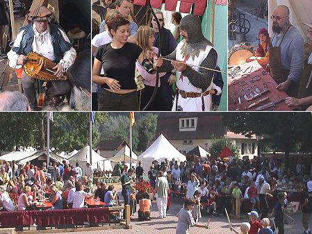 In Hirschhorn regierten zwei Tage lang die Rittersleut' (Fotos:Richter)(hr) Mittelalterliche Zustände herrschten am vergangenen Wochenende wieder in Hirschhorn. Beim Ritterfest gab es am Samstag und Sonntag wie alljährlich ein historisches Handwerkerdorf und Ritterlager mit Gauklern, Ablasspredigern, Geschichtenerzählern, Zauberern, Mystikern und Musikanten. Vorführungen fanden auf dem Chateau-Landon-Platz statt. Wer Lust hatte, konnte sich im Ritterlager im "Saustechen", "Drachentöten", Ringewerfen, Armbrust- und Bogenschießen sowie im Axt- und Speerwerfen üben.